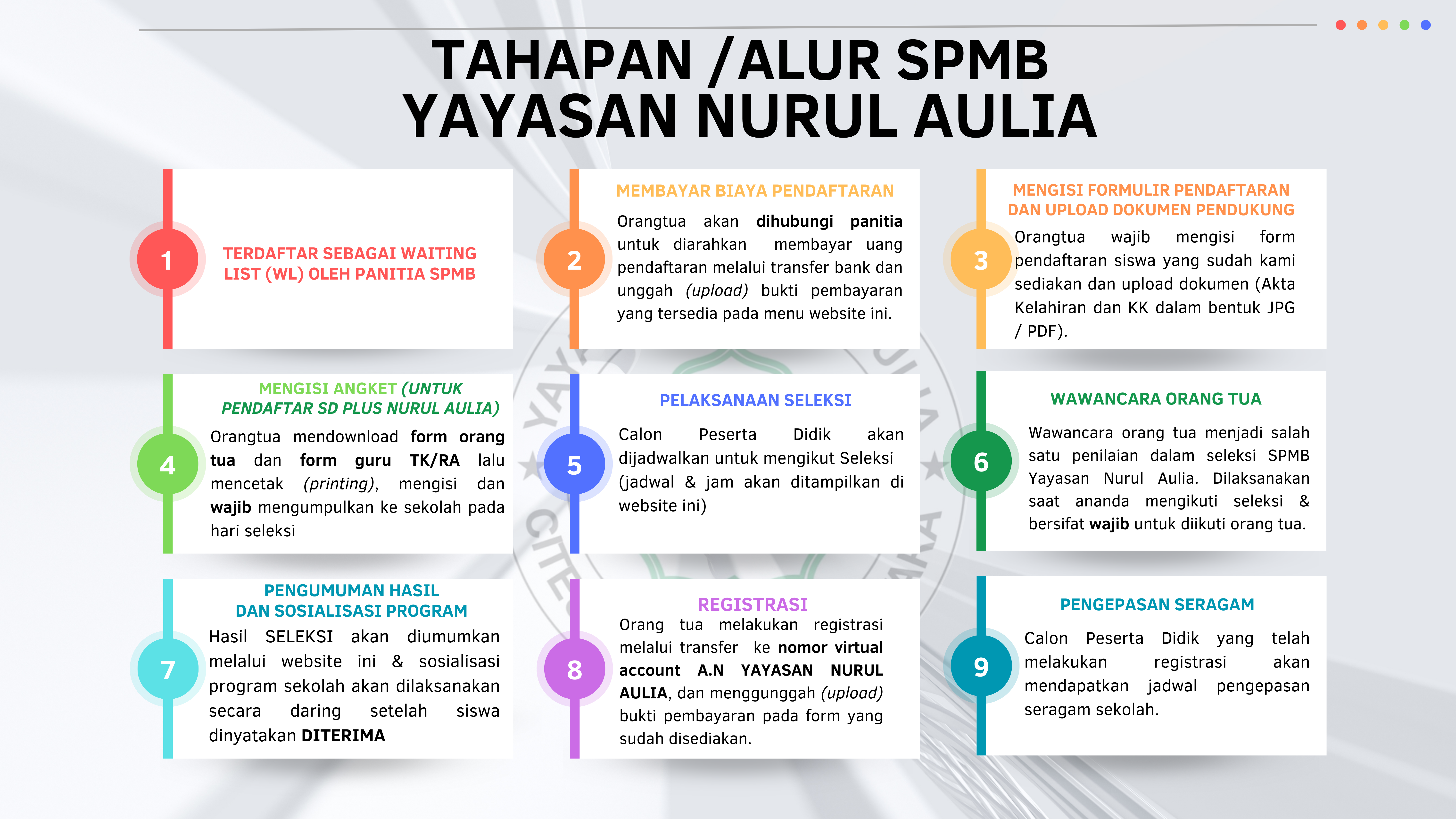 Ayah/Bunda bisa langsung datang ke Nurul Aulia setiap Senin - Jum'at mulai pukul 09.00 - 14.00 wib menghubungi panitia PPDB 24/25