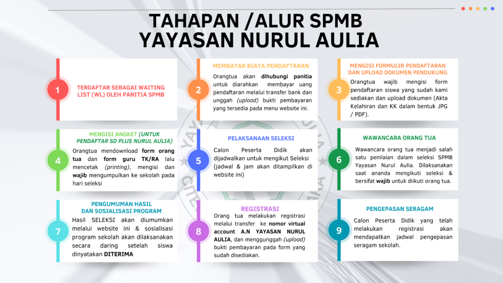 ayah/bunda bisa langsung datang ke Nurul Aulia setiap Senin - Jum'at mulai pukul 09.00 - 14.00 wib menghubungi panitia PPDB 24/25